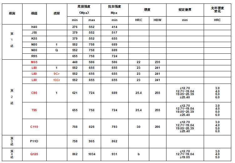 2.2.1API 5CT標(biāo)準(zhǔn)中套管、油管鋼級(jí)包括: