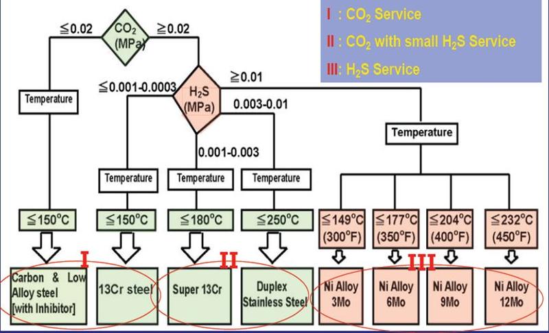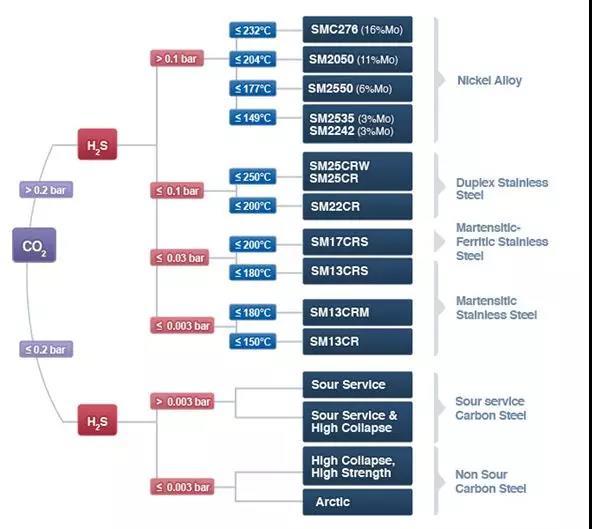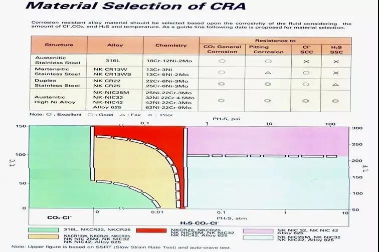 在CO2和H2S共存,或H2S分壓未達(dá)臨界但Cl-很高,13Cr鋼(包括超級(jí)13Cr鋼)是不能滿足要求的,需要采用22Cr雙相不銹鋼(ASF2205)或超級(jí)雙相不銹鋼25Cr,甚至要采用含Cr20%以上、含Ni30%以上的高Ni、Cr不銹鋼和Ni基與FeNi基合金如G3、825、028。