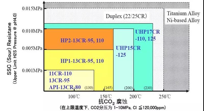JFE的JFE-UHP-15Cr-125和JFE-UHP-17Cr-110~125有比超級(jí)13Cr更高的強(qiáng)度和抗CO2腐蝕能力,但在CI-很高的條件下并不能取代雙相不銹鋼。