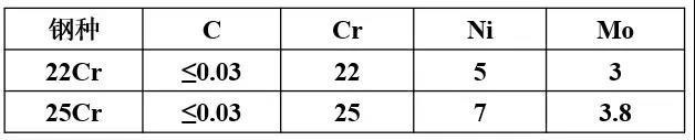 當(dāng)含有CO2的油(氣)井溫度超過(guò)200℃時(shí),馬氏體不銹鋼SUP15Cr也不能滿足耐腐蝕要求,需采用具有良好的耐CO2和CI-應(yīng)力腐蝕裂紋性能的雙相不銹鋼。目前開發(fā)的22Cr和25Cr雙相(奧氏體相和鐵素體相)不銹鋼適用于200℃以上的CO2 油氣井,其化學(xué)成分見(jiàn)表3。