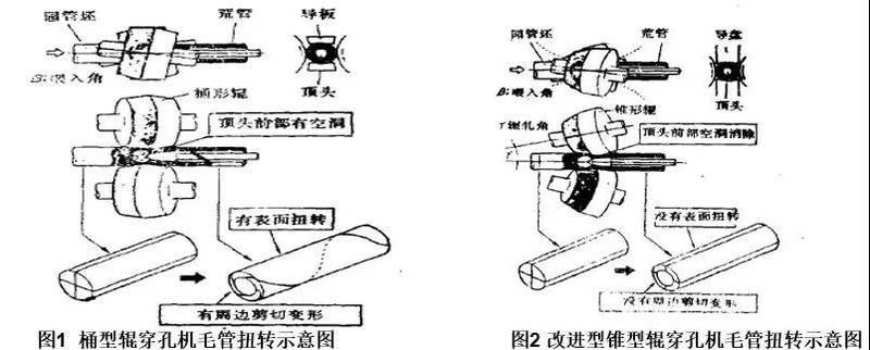 從工藝參數(shù)方面講,錐輥式穿孔機(jī)基本要點(diǎn)是兩個(gè)角度值即輾軋角 和送進(jìn)角,前者對(duì)一個(gè)機(jī)組來(lái)講是定值,后者送進(jìn)角是可調(diào)的。輾軋角和送進(jìn)角的各種配合,對(duì)穿孔過(guò)程中的剪切變形將產(chǎn)生相當(dāng)大的影響。圖1、圖2 分別是桶型輥穿孔機(jī)和改進(jìn)型錐形穿孔機(jī)穿孔毛管的不同扭轉(zhuǎn)說(shuō)明。