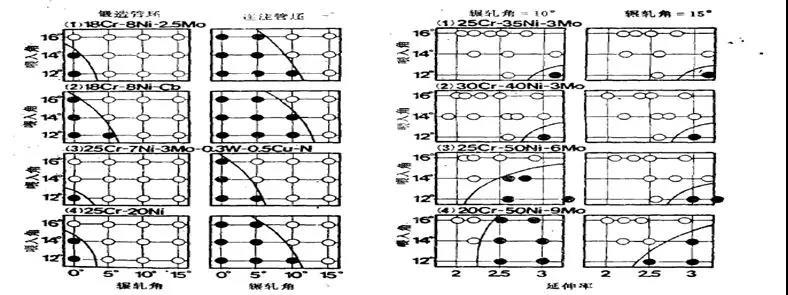 日本住友公司從上世紀(jì)80年代就開始研究使用改進(jìn)型穿孔機(jī)穿孔馬氏體不銹鋼、奧氏體不銹鋼、雙相鋼及鎳基合金等高合金鋼管。試驗(yàn)結(jié)果見(jiàn)圖3。得出的結(jié)論如下: