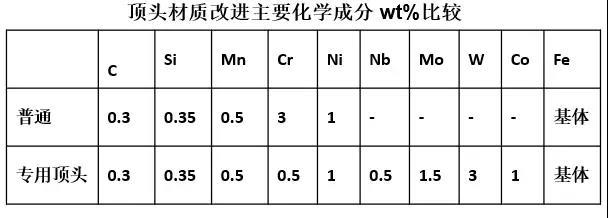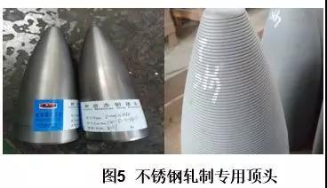 ①頂頭  目前可選擇的辦法:頂頭潤(rùn)滑、頂頭材質(zhì)改變,見(jiàn)表(增加Mo\W的含量)、使用復(fù)合頂頭(表面層用Mo基合金,芯部為工具鋼)及鉬基頂頭等。見(jiàn)圖5。