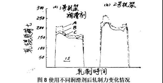 ④芯棒潤(rùn)滑:為防止不銹管的碳污染以及提高芯棒的使用壽命,現(xiàn)有的石墨潤(rùn)滑劑已經(jīng)不能滿足要求,需使用無(wú)碳的潤(rùn)滑劑,下表和圖8分別是新型芯棒潤(rùn)滑劑基本組成和使用前后軋制力變化示意圖。