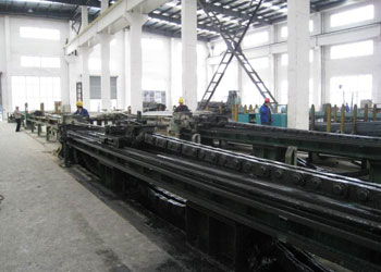 2) 連續軋管生產 生產設備由穿孔機、連續軋管機、張力減徑機組成。圓坯穿成毛管后插入芯棒,通過7~9架軋輥軸線互呈90°配置的二輥式軋機連軋。軋后抽芯棒,經再加熱后進行張力減徑,可軋成長達165m的鋼管。140mm連續軋管機組年產40~60萬噸,為自動軋管機組的2~4倍。這種機組的特點是適于生產外徑168mm以下鋼管,設備投資大,裝機容量大,芯棒長達30m,加工制造復雜。70年代后期出現的限動芯棒連續軋管機(MPM),軋制時外力強制芯棒以小于鋼管速度運動,可改善金屬流動條件,用短芯棒軋制長管和大口徑鋼管