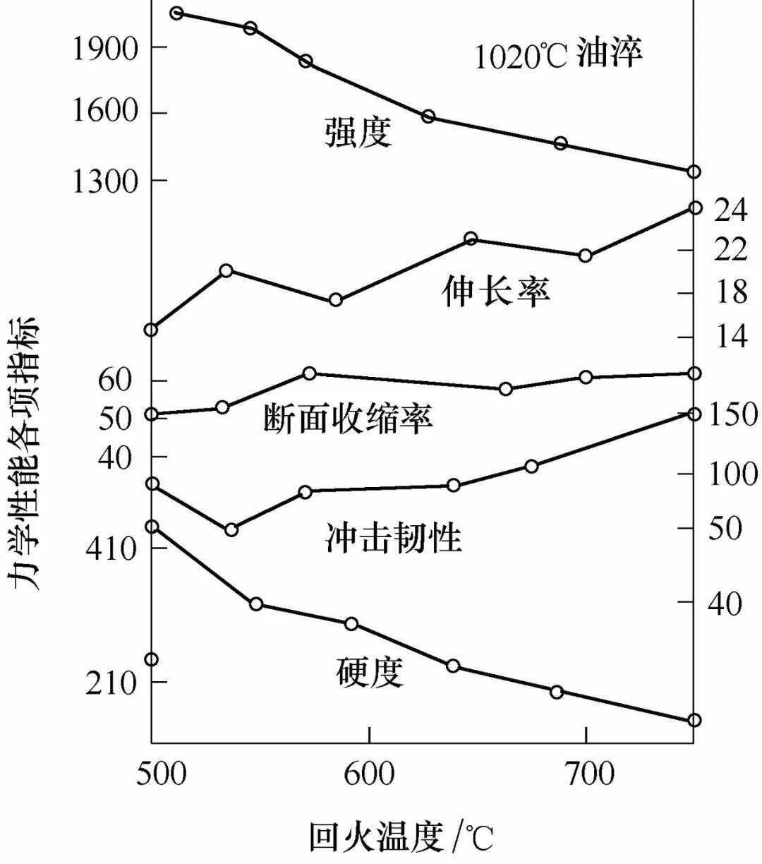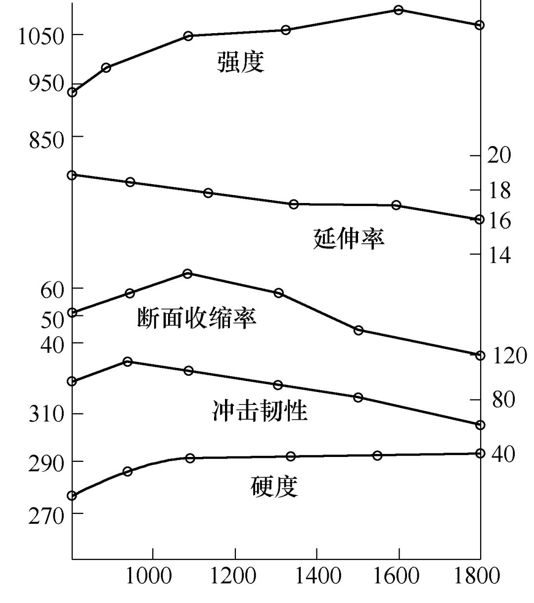 圖1 淬火溫度與力學性能關系(試樣經600℃、2h回火)
