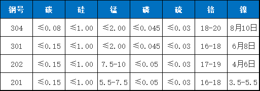 不銹鋼在冶煉過程當中,由于加入合金元素品種不同,不同品種加入量的不同。其特性也是不同的,為了加以區別則冠上了不同的鋼號,下面是常見裝飾用不銹鋼不同鋼號“合金元素”含量表僅供參考: