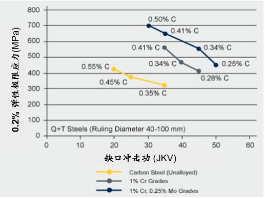 添加1%Cr使屈服強度提高了大約50%,再添加0.25%的Mo進一步提高了強度,且完全硬化部分直徑從100mm延長到500mm。