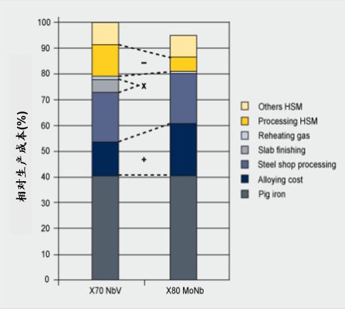 有一種觀點認為鉬合金化會導致成本劣勢,但經過全面的成本效益分析,可以證明這種觀點是錯誤的。將常用的NbV微合金化X70鋼與當今先進的低碳 NbMo鋼相比較,后者的合金元素成本確實更貴。 但是,由于后者生產工藝效率更高,質量成本更低,因此基于熱軋帶鋼的NbMo鋼制造總成本更低。 此外,NbMo合金鋼的加工制造如同X80。 在項目中使用X80而不是X70,需要的鋼材更少,可以大大節省成本(參見圖2和圖3),因為材料成本約占管道項目總成本的30%。
