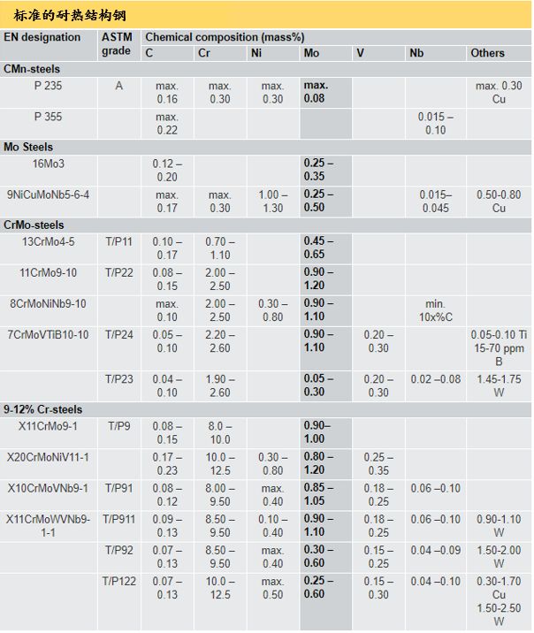 抗蠕變鐵素體鋼目前仍然是全球電廠,煉油廠和石油化工廠的常用材料。這類鋼分為CMn鋼,Mo鋼,低合金CrMo鋼和9-12%Cr鋼。由于各類鋼有很多不同的鋼種,表1僅列出每類鋼的幾個代表性牌號。
