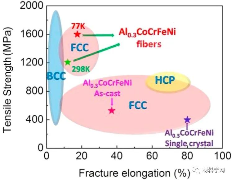綜述所述,本文研究了五元Al0.3CoCrFeNi HEA纖維的微觀結構和力學性能的影響。采用熱旋鍛和熱拉工藝制備的HEA纖維主要織構為<111>和<100>織構。Al和Ni原子之間的強相互作用產生了大約200nm的B2 Al-Ni粒子。在HEA纖維的拉伸試驗中,析出的顆粒和細小的晶粒共同促進了纖維的持續高強度和延展性。特別是直徑為1.00 mm的纖維在298K時表現出了顯著的拉伸強度和延展性,分別為1207 MPa和7.8%,在77K時分別提高到1600 MPa和17.5%。與298K時的平面滑移變形機制相比,77K時變形后出現了形變誘導的納米孿晶,從而提高了77k時的拉伸強度和延性。HEA纖維在低溫下強度與延性的良好結合,為未來高性能HEAs工程材料的開發開辟了一條創新的道路。