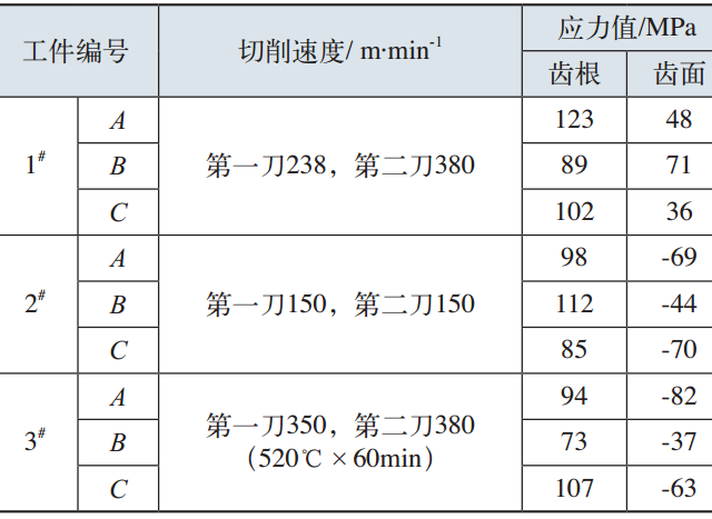 為了證明猜測(cè),對(duì)齒輪加工應(yīng)力進(jìn)行檢測(cè)。對(duì)于出現(xiàn)問(wèn)題的工件加工參數(shù)進(jìn)行試驗(yàn),每個(gè)工件分120°,切取A、B、C三個(gè)點(diǎn),每個(gè)點(diǎn)檢測(cè)齒面和齒根各一點(diǎn),檢測(cè)位置距離表面0.025mm。檢測(cè)結(jié)果見(jiàn)表1(表中正值為拉應(yīng)力,負(fù)值為壓應(yīng)力)。