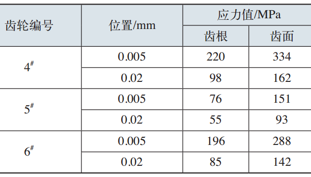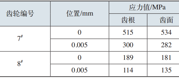 根據(jù)檢測(cè)結(jié)果可以看出,切齒齒根出現(xiàn)壓應(yīng)力,根據(jù)加工方式來(lái)說(shuō)應(yīng)該是拉應(yīng)力,我們認(rèn)為是否檢測(cè)有問(wèn)題。再次隨機(jī)抽取現(xiàn)有的兩件工件,調(diào)來(lái)兄弟公司一件采用干切削加工的相同工件;每件檢測(cè)兩個(gè)位置,每個(gè)位置檢測(cè)0.005mm、0.02mm位置的殘余應(yīng)力。檢測(cè)結(jié)果見(jiàn)表2。