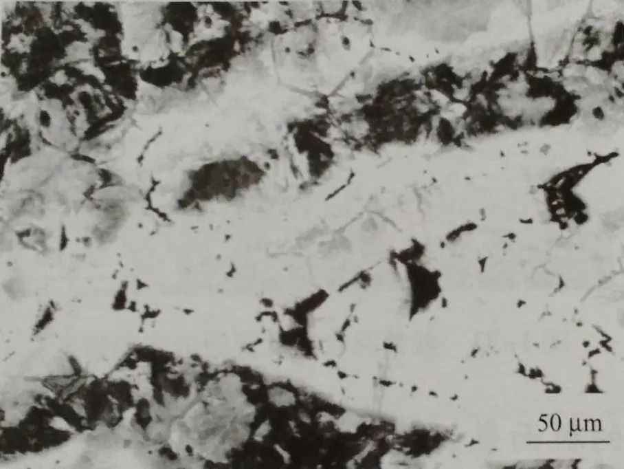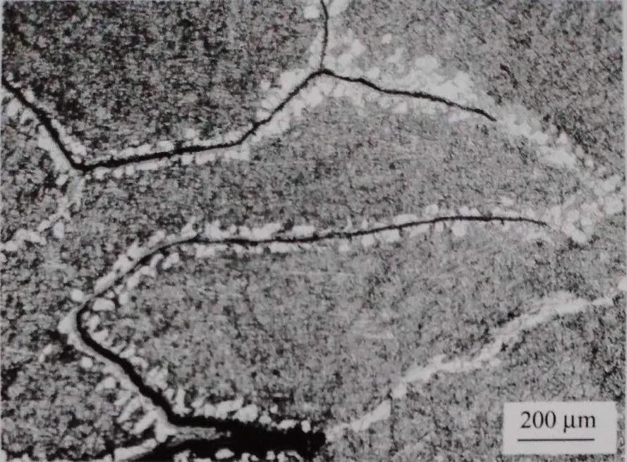 取截面金相試樣進行顯微觀察,主裂紋附近有一些呈網絡狀分布的細裂紋、孔貌及 MnS 夾雜物(圖1-28)。