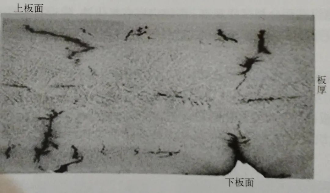 取鋼板縱截面低倍試樣作熱酸蝕檢驗,鋼板內部有嚴重的裂紋。裂紋位于板面與中心之間,形狀不規則,多呈曲線狀,其中靠近下板面一側的裂紋距板面較近,有的已暴露,見圖1-27 。另外,從酸蝕面上還可以看到鋼板枝晶較發達。微觀特征: