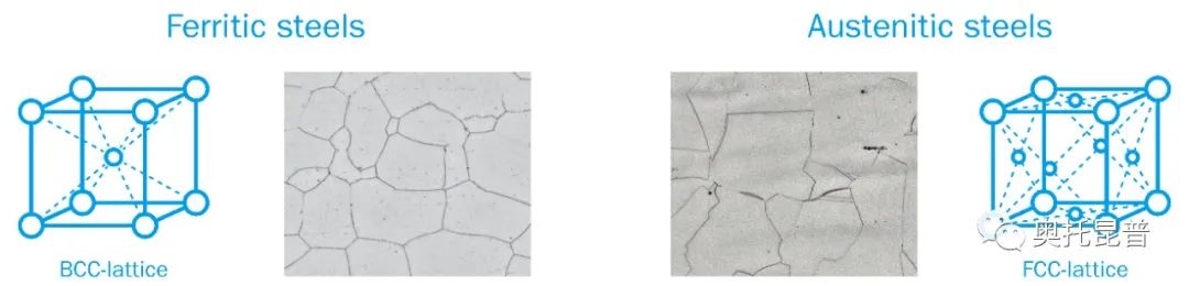 在室溫下,純鐵作為鐵素體存在。在高于911°C的溫度下它會轉變成奧氏體。但是,稱為奧氏體形成劑的特殊合金元素(如鎳,錳,鈷或氮)可使奧氏體在室溫下存在。由于其特征性的fcc微觀結構,奧氏體鋼表現出與鐵素體鋼不同的性能,特別是在耐腐蝕性方面。