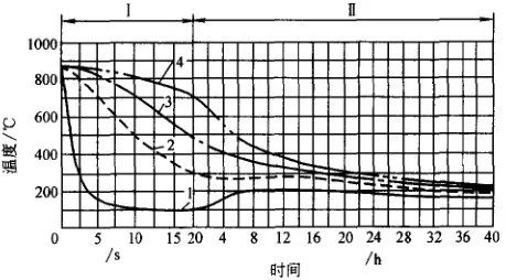 不小于υ1終冷溫度不高于450°C。如要使鍛件心部獲得馬氏體組織,必須保證鍛件心部冷卻速度不低于υ2, 且應過冷到300℃以下。在確定終冷保持時間時,必須充分考慮組織轉變熱效應的影響。
