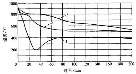 油冷時鍛件中最大溫差比水冷小,一般不超過500℃。圖7~圖10 是不同截面鍛件的油冷冷卻曲線。采用空-油冷卻(延遲淬冷)可顯著降低工件內外溫差(見圖11 ) 。