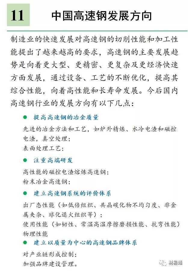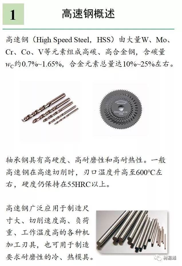 高速鋼(HSS)是一種具有高硬度、高耐磨性和高耐熱性的工具鋼,又名風(fēng)鋼或鋒鋼,意思是淬火時即使在空氣中冷卻也能硬化,并且很鋒利,或稱白鋼。高速鋼材料主要由兩種基本成分構(gòu)成:一種是金屬碳化物(如碳化鎢、碳化鉬或碳化釩),它賦予材料較好的耐磨性及強度;二是分布在碳化物周圍的鋼基體,它使材料具有較好的韌性和吸收沖擊、防止碎裂的能力。高速鋼的紅硬性高、耐磨性好、工藝性能好、強度和韌性配合好,因此主要用來制造復(fù)雜的薄刃和耐沖擊的金屬切削刀具,也可用于制造性能要求高的冷作模具、軋輥、高溫軸承和高溫彈簧等。