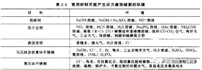 腐蝕工況 | 一般認(rèn)為,純金屬不會(huì)發(fā)生SCC,含雜質(zhì)的金屬或合金才會(huì)發(fā)生SCC。 典型的有:黃銅-氨溶液、奧氏體SS-Cl-溶液、碳鋼-OH-溶液、低合金高強(qiáng)度鋼-潮濕大氣(甚至蒸餾水),詳細(xì)的見表2-1。