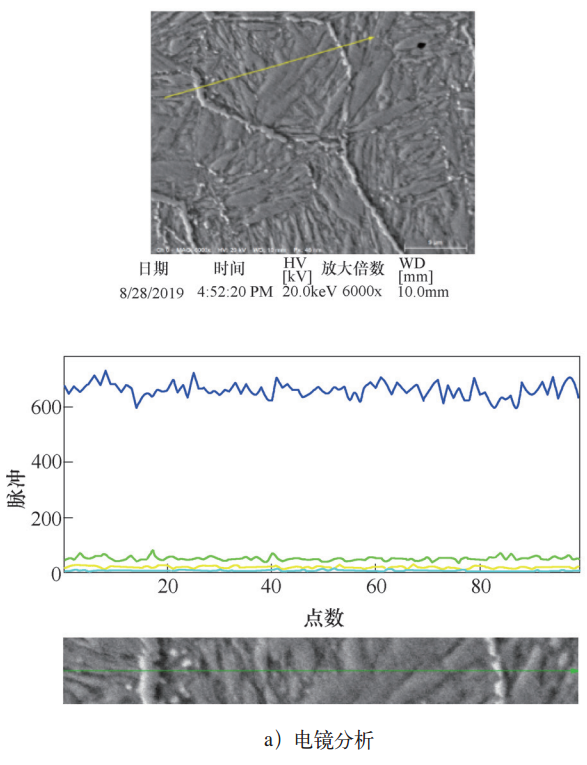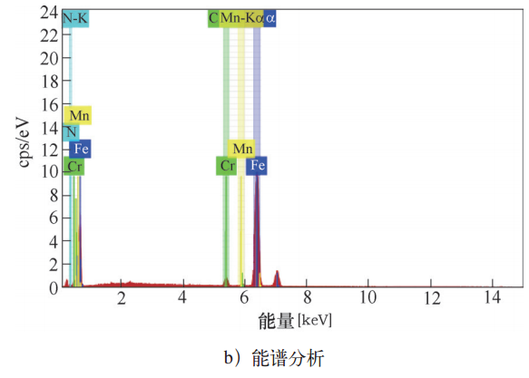 對“黑線”組織進行電鏡及能譜分析,如圖3所示。電鏡圖片顯示,黑線為凸起物,應為與基體不同的物質,能譜線掃描顯示,凸起部位含氮高于基體。