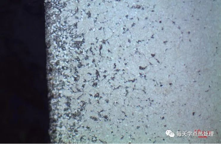將碳氮共滲中工件的橫截面拋光后,在未腐蝕或輕微腐蝕的狀態下,使用光學顯微鏡在表面滲層中有時可觀察到一些分散的大小不一的黑色或暗灰色的斑點、黑帶和黑網,這些深色的斑點、黑帶和黑網,統稱為黑色組織。黑色組織的深度一般不超過0.05mm。深色的斑點是一些主要沿奧氏體晶界分布的大小不一的孔洞。黑色帶通常出現在距表面0.03mm深度內,黑帶的內測往往可觀察到黑色網,主要由于表層形成了某些合金元素的碳氧化物、氮氧化物和碳化物等小顆粒,使奧氏體中合金元素貧化,導致淬透性降低而形成了托氏體的結果。碳氮共滲的黑色組織類似于氣體滲碳的內氧化,使表面硬度下降,有益的殘余壓應力減小,或表面形成殘余拉應力,導致疲勞強度的降低。20Cr2Ni4A鋼碳氮共滲試樣表面黑色組織可使彎曲疲勞強度降低約6%。