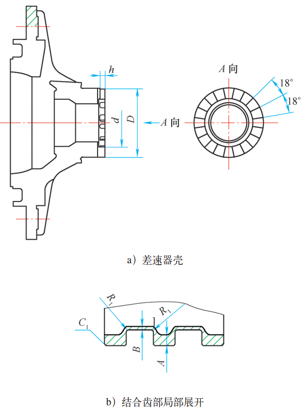 某牙嵌強(qiáng)制鎖住式差速器殼材料為40Cr鋼,結(jié)構(gòu)如圖1所示,實(shí)體如圖2所示。圖1a中d與D結(jié)合齒部淬火,硬化層如圖1b所示,淬火區(qū)在圖2中紅色方框內(nèi)端面齒部,硬化層深:R1處≥1mm,A處3~9mm,B處≥1mm。
