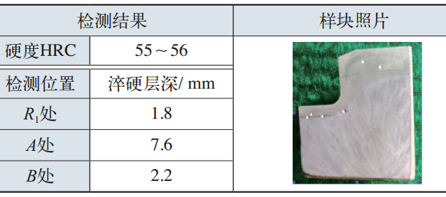異形感應(yīng)器具體設(shè)計(jì)參數(shù)見(jiàn)表4,調(diào)試參數(shù)見(jiàn)表5,淬硬層檢測(cè)結(jié)果見(jiàn)表6。