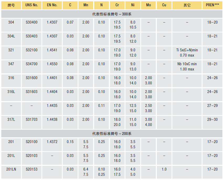 不銹鋼發(fā)明于二十世紀(jì)初,是英國(guó)和德國(guó)的一項(xiàng)創(chuàng)舉。在隨后的半個(gè)世紀(jì)中,開發(fā)了一系列的不銹鋼牌號(hào), 它們成功地應(yīng)用于化工、能源、食品及其它行業(yè)。二十世紀(jì)七十年代初期,隨著鋼廠引入新的精煉和鑄造技術(shù),不銹鋼進(jìn)入了現(xiàn)代發(fā)展階段。不銹鋼研發(fā)者和生產(chǎn)商利用這些技術(shù)對(duì)已有的 “標(biāo)準(zhǔn)牌號(hào)” 進(jìn)行了改進(jìn),同時(shí)還開發(fā)了性能更優(yōu)的新牌號(hào),其中包括新型高性能奧氏體不銹鋼。 新的煉鋼技術(shù)包括氬氧脫碳(AOD)和真空吹氧脫碳(VOD)工藝。采用這兩種工藝,可以有效地實(shí)現(xiàn)超低碳含量、高合金回收率、較好的成分控制特別是氮含量的精準(zhǔn)控制。電渣重熔法(ESR)可作為一種替代或補(bǔ)充工藝,更好地控制成分,使顯微組織更均勻,夾雜物更少。連鑄技術(shù)提高了生產(chǎn)效率,進(jìn)一步降低了生產(chǎn)成本。 煉鋼技術(shù)的進(jìn)步降低了標(biāo)準(zhǔn)低碳牌號(hào)如304L和316L的生產(chǎn)成本,改善了焊接部件的耐腐蝕性能。第一個(gè)采用新技術(shù)生產(chǎn)的高性能奧氏體不銹鋼牌號(hào)是904L(N08904),是由奧托昆普(Outokumpu)不銹鋼公司開發(fā)的。904L不銹鋼的碳含量非常低,是現(xiàn)有鑄造合金的可焊接鍛軋牌號(hào),對(duì)強(qiáng)還原性酸環(huán)境有很高的耐腐蝕性能。1973年,ATI Allegheny Ludlum 公司推出了第一個(gè)完全耐海水腐蝕的奧氏體不銹鋼牌號(hào)AL-6X?(N08366),其Mo含量為6%,碳含量很低,可用于生產(chǎn)焊接薄板和管材。七十年代中期,氮的使用和控制得到了發(fā)展,進(jìn)一步改進(jìn)了6%Mo不銹鋼的性能,實(shí)現(xiàn)了厚斷面材料的焊接,并且能夠防止有害金屬間相(會(huì)降低耐點(diǎn)蝕性能)的形成。下表列出了含氮6%Mo不銹鋼牌號(hào)的UNS編號(hào)及相應(yīng)生產(chǎn)廠的商品名稱。 二十世紀(jì)九十年代,新興的能源和環(huán)保工業(yè)對(duì)高性價(jià)比、高性能合金材料的需求日益增長(zhǎng),對(duì)不銹鋼的耐腐蝕性能提出了更高的要求。開發(fā)出三個(gè)Mo含量約為7%、氮含量相對(duì)較高的不銹鋼牌號(hào), 它們?cè)诟g性含氯水中具有特別高的耐點(diǎn)蝕性能。這組高合金化的不銹鋼牌號(hào)為S32654、S31266和S31277,其性能與一些高耐蝕性的鎳基合金很接近,而成本卻低得多。下表給出了7%Mo不銹鋼牌號(hào)及生產(chǎn)廠的商品名稱。 加工制造中的換熱器管板?Sandvik 表1列出了一些常見(jiàn)標(biāo)準(zhǔn)300系和200系奧氏體不銹鋼的化學(xué)成分。高性能奧氏體不銹鋼的化學(xué)成分見(jiàn)表2。高性能奧氏體不銹鋼的鉻、鎳和鉬的含量遠(yuǎn)高于標(biāo)準(zhǔn)的18Cr-8Ni不銹鋼,很多牌號(hào)還添加了氮。 表1 常見(jiàn)標(biāo)準(zhǔn)鍛軋300系和200系奧氏體不銹鋼的化學(xué)成分*(重量%)和耐點(diǎn)蝕當(dāng)量(PREN)** 說(shuō)明: * 選自ASTM關(guān)于中厚板、薄板和帶材的標(biāo)準(zhǔn)規(guī)范或企業(yè)的數(shù)據(jù)資料。 ** 一般指化學(xué)成分最大值,除非標(biāo)出范圍或最小值。EN的化學(xué)成分與ASTM的化學(xué)成分不完全一致。 *** 根據(jù)公式PREN = %Cr + 3.3(%Mo + 0.5%W)+ 16(%N)計(jì)算出的耐點(diǎn)蝕當(dāng)量及該牌號(hào)預(yù)期的名義化學(xué)成分。 表2 常見(jiàn)的高性能奧氏體不銹鋼的化學(xué)成分*(重量%)和耐點(diǎn)蝕當(dāng)量(PREN)** 說(shuō)明: * 選自ASTM關(guān)于中厚板、薄板和帶材的標(biāo)準(zhǔn)規(guī)范或企業(yè)的數(shù)據(jù)資料。 ** 一般指化學(xué)成分最大值,除非標(biāo)出范圍或最小值。EN的化學(xué)成分與ASTM的化學(xué)成分不完全一致。 *** 根據(jù)公式PREN = %Cr + 3.3(%Mo + 0.5%W)+ 16(%N)計(jì)算出的耐點(diǎn)蝕當(dāng)量及該牌號(hào)預(yù)期的名義化學(xué)成分。