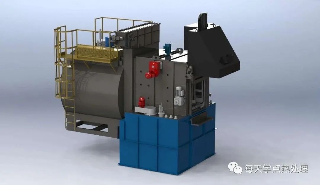 其主要功能是按工藝要求對爐內機械動作實行自動控制。密封箱式滲碳爐可實現三種工藝方式,即直接淬火、重新加熱淬火和氣體淬火。它們的操作程序都儲存在可編程序控制器中。①工藝過程自動控制。按滲碳工藝要求分為三類:滲碳工藝、修正滲碳工藝(即對已滲碳工藝的返修工藝)和保護氣氛熱處理。這三類工藝又可按不同淬火方式分別編制程序。計算機工藝程序編制是通過鍵盤輸人的,輸入材料數據和過程數據,例如,鋼材碳含量、合金化系數、炭黑極限、爐氣中H2、CO含量,有效硬化層深度及其碳含量等;再輸入各個程序段的數據,如設定溫度、設定滲碳最終要求達到的滲層深度等。計算機按工件最終目標進行控制,調節工藝參數,當達到99%的滲碳層深后,爐溫降到淬火溫度并保溫,到達要求的滲碳深度后,工件出爐送往淬火槽。②滲碳工藝的模擬仿真功能。在計算機控制中,通過模擬運算可實時顯示溫度和碳勢工藝曲線及實時記錄曲線、表面碳濃度梯度、設定溫度和碳勢、實時滲層深度和時間等內容。從而以總覽的形式表示各種溫度和碳勢的狀況。采用雙速電動機,有負荷時慢速運動;空載時快速運動。由可編程序控制器按工藝過程要求控制。工件入油淬火時,升降臺下降速度由快變慢,由雙速電動機帶動。3) 兩臺獨立的淬火油攪拌裝置,其攪拌速度可變,在工件入油后可分期控制淬火強度。以上機械動作的傳動電動機,除爐門、中爐門和攪拌風扇外,均采用雙速電動機,均由可編程序控制器控制,在程序控制下實現自動切換。4) 控制裝卸料、淬火升降臺、爐門和爐頂風扇的電動機一旦停電,均可用手柄搖動。為了加快滲碳后工件在前室的冷速,除在前室頂部安裝有大功率的離心風扇外,為防止在前室壁結露,還在其頂部和兩側面安裝了扁平油箱,內充普通全損耗系統用油,熱油通過循環泵進入爐體外側的水冷卻器。在進入冷卻器的熱油管路上安裝了一個溫度傳感器,控制供水閥的開度,實現了前室爐壁油的自動循環冷卻,其油溫控制在70℃左右。