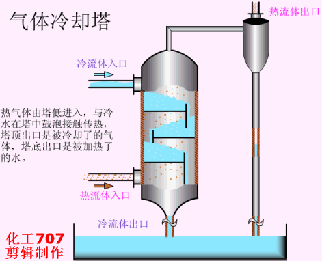 熱氣體由塔底進(jìn)入,與冷水在塔中鼓泡接觸傳熱,塔頂出口是被冷卻了的氣體,塔底出口是被加熱了的水。