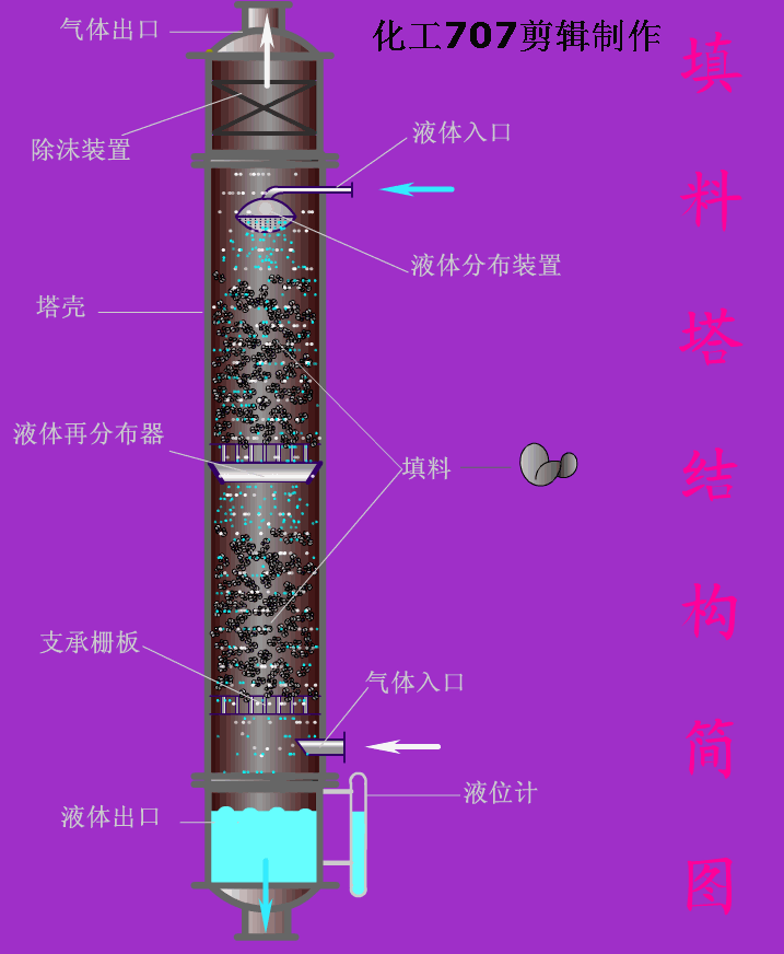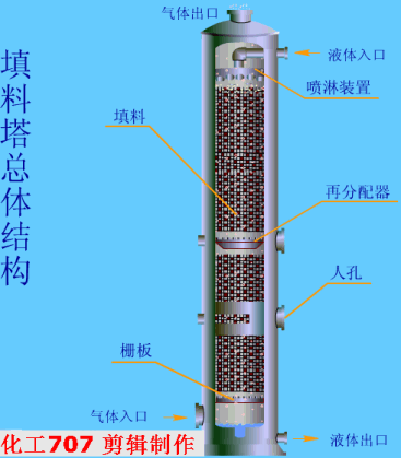 填料塔是以塔內(nèi)的填料作為氣液兩相間接觸構(gòu)件的傳質(zhì)設(shè)備。填料塔塔身是一直立式圓筒,底部裝有填料支承板,填料以亂堆或整砌的方式放置在支承板上。填料的上方安裝填料壓板,以防被上升氣流吹動(dòng)。液體從塔頂經(jīng)液體分布器噴淋到填料上,并沿填料表面流下。氣體從塔底送入,經(jīng)氣體分布裝置(小直徑塔一般不設(shè)氣體分布裝置)分布后,與液體呈逆流連續(xù)通過填料層的空隙,在填料表面上,氣液兩相密切接觸進(jìn)行傳質(zhì)。填料塔屬于連續(xù)接觸式氣液傳質(zhì)設(shè)備,兩相組成沿塔高連續(xù)變化,在正常操作狀態(tài)下,氣相為連續(xù)相,液相為分散相。