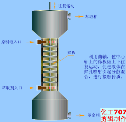 利用曲軸,使中心軸上的篩板做上下往復(fù)運(yùn)動(dòng),促進(jìn)液體在篩孔噴射引起分散混合,進(jìn)行接觸傳質(zhì)。