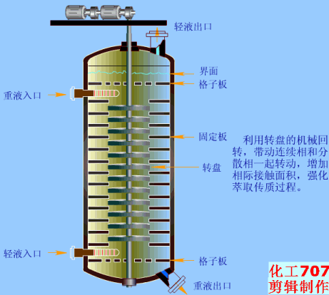 利用轉(zhuǎn)盤的機(jī)械回轉(zhuǎn),帶動(dòng)連續(xù)相和分散相一起轉(zhuǎn)動(dòng),增加相際接觸面積,強(qiáng)化萃取傳質(zhì)過程。
