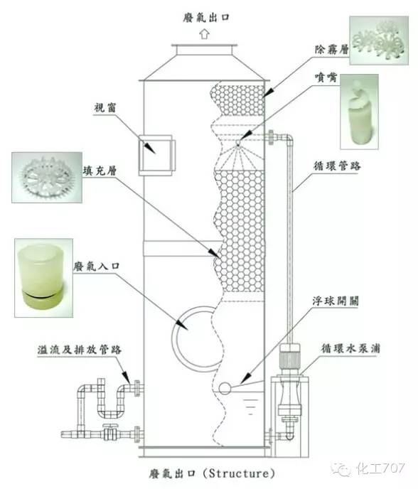 被吸收的混合氣由塔底進(jìn)入,吸收液從塔頂噴淋而下,液體與氣體在填料表面進(jìn)行氣-液傳質(zhì)。