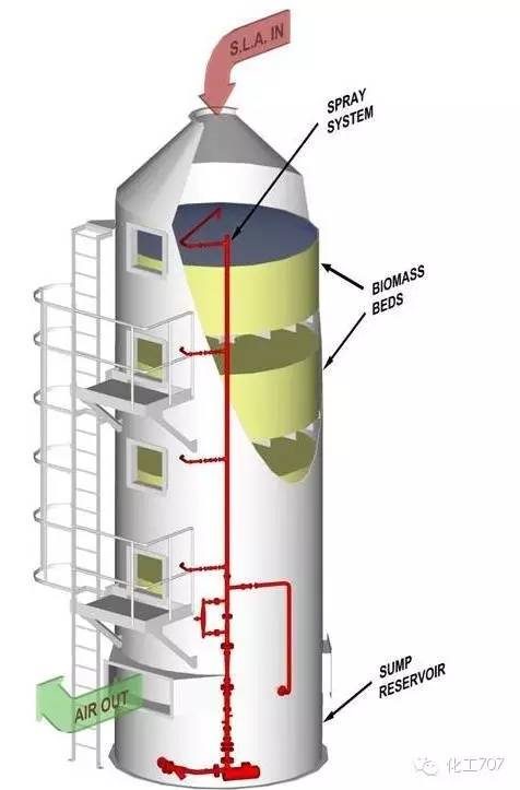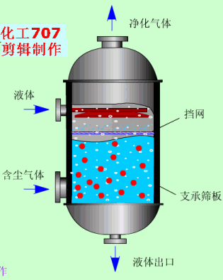 塔內(nèi)放油一定量的聚乙烯球形填料,氣速達(dá)到一定值時(shí),小球懸浮并劇烈翻騰旋轉(zhuǎn)和相互碰撞,達(dá)到傳質(zhì)和除塵的效果。