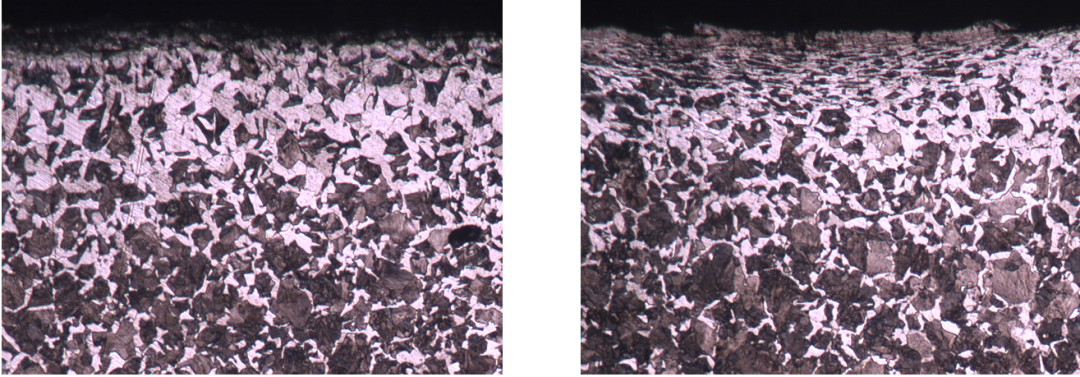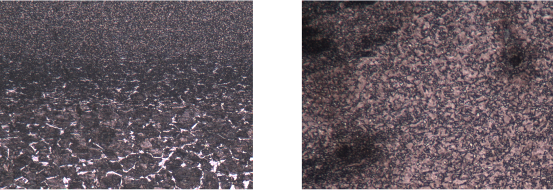 圖9 工件表面脫碳層(100×) 圖10 脫碳層內(nèi)變形組織(100×)