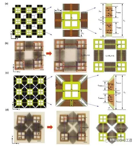圖1 受到kirigami啟發(fā)的具有巨大正熱膨脹的2D分級(jí)超材料的設(shè)計(jì)策略和實(shí)驗(yàn)演示。a)分層設(shè)計(jì)和關(guān)鍵幾何參數(shù)的說(shuō)明。b)在(左)和(中)增加30°C之前(左)和之后(中)制造的超材料樣品的光學(xué)圖像,以及通過(guò)有限元分析預(yù)測(cè)的變形配置(右)。設(shè)計(jì)參數(shù)包括(Le/L1、LPI/WPI、LPMMA/LPI、L2/L1、WPI/WPMMA、WPI/WGap、L1、LJoint和WPI) = (0.86、62.8、0.8、0.35、1、1、15 mm、2 mm和100 m)。c)在基本致動(dòng)元件的垂直長(zhǎng)度上具有梯度的分級(jí)設(shè)計(jì)的圖示,以及相應(yīng)的幾何參數(shù)。d)制造的超材料樣品在20℃升高之前(左)和之后(中)的光學(xué)圖像,以及有限元分析預(yù)測(cè)的變形結(jié)構(gòu)(右)。設(shè)計(jì)參數(shù)包括(Le,1/L1,LPI,1/WPI, LPMMA/LPI, L2/L1, WPI/WPMMA, WPI/WGap, L1, LJoint和WPI) = (0.84,52.8,0.8,0.37,1,1,15 mm,2 mm,100 m)。比例尺:5毫米。