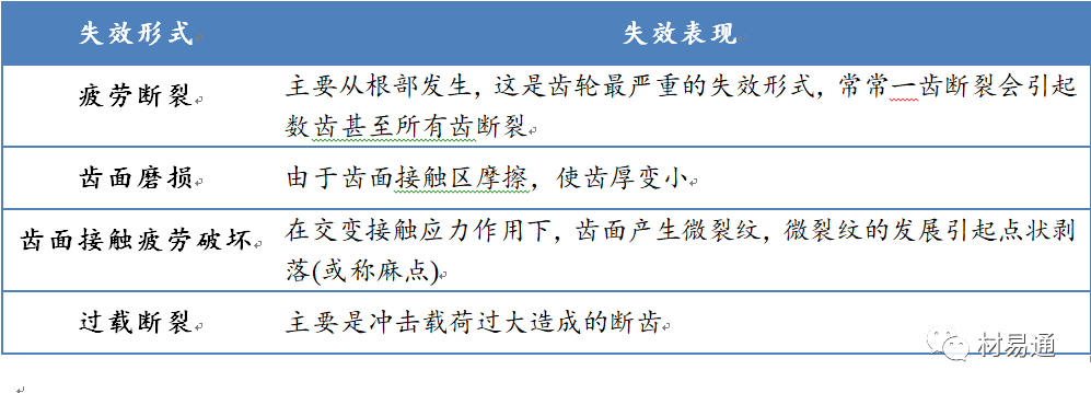 根據齒輪的工作條件,其主要失效形式是疲勞斷裂、齒面接觸疲勞破壞、齒面磨損以及過載斷裂。汽車齒輪的主要失效形式及失效表現見表。