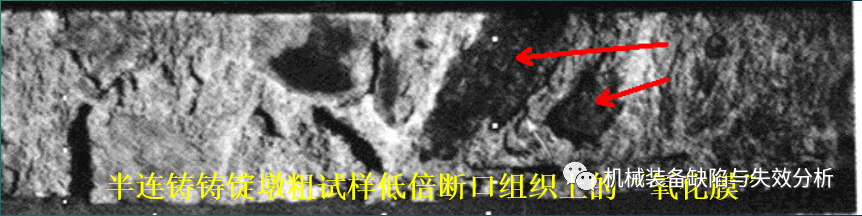低倍金相組織中發現“小分層”,其斷口組織為灰色、褐色、灰黃色或銀灰色片狀物,通常稱為“氧化膜”,光學顯微鏡下觀察其組織為韌窩狀或沿晶界或枝晶邊界分布的條狀物。氧化物成分為:Al2O3、MgO等。