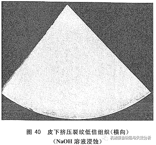 在模壓鍛件低倍試樣的邊緣,出現由內向里斜向延伸,終端常呈須狀分叉的光滑折縫線稱為壓折。壓折通常出現在模鍛件的肋條與腹板之間的過渡圓弧位置,壓折處一般伴隨著有局部流紋不順。