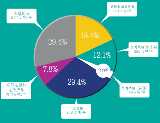 過去20年中國不銹鋼產量的增長帶動了全球不銹鋼產量以每年約6%的速度遞增。2015年,中國不銹鋼產量占世界總量一半以上(53%)。不銹鋼消費量從2000年的10%上升為39%。平均而言,目前消費后可回收的材料大約是20年前投入使用的,這充分說明不銹鋼使用壽命長。從該圖可以看出,理論計算的最大再生量受到報廢回收不銹鋼的可用性限制,報廢回收可用性又取決于終端產品過去的產量、增長率和使用壽命。
