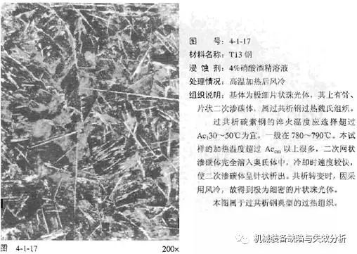 在實際生產中,ωc<0.6%的亞共析鋼和ωc>1.2%的過共析鋼在鑄造、熱軋、鍛造后的空冷,焊縫或熱影響區空冷,或者當溫度過高并以較快速度冷卻時,先共析鐵素體或先共析滲碳體從奧氏體晶界沿奧氏體一定晶面往晶內生長,呈針片狀析出。