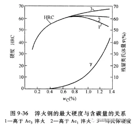 (2)含碳量對馬氏體性能的影響:硬度主要取決于含碳量。ωC<0.5%時馬氏體的硬度隨著含碳量增加急劇增高,當ωC>0.6%左右雖然馬氏體硬度有所增高,但是由于殘余奧氏體量增加,反而使得鋼的硬度有所下降。