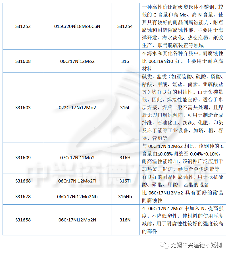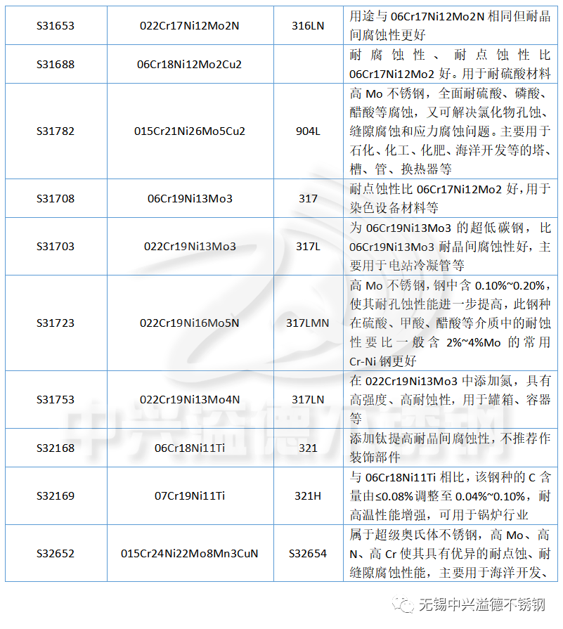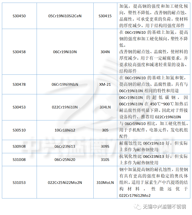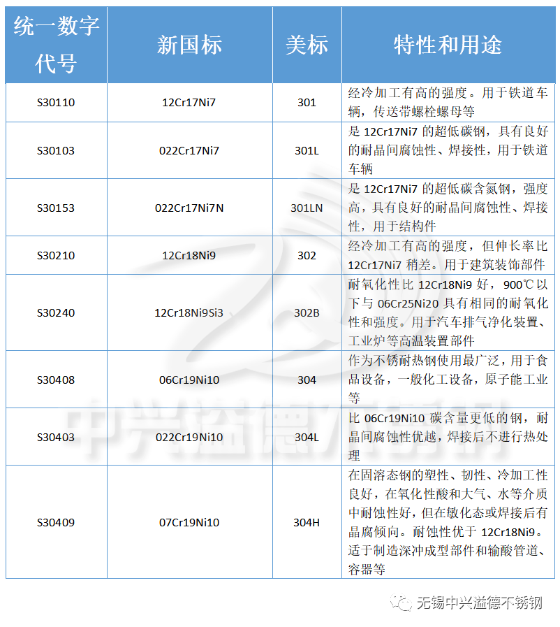 下面中興溢德小編匯總了奧氏體不銹鋼的中美不銹鋼牌號、特性和用途,如下表: