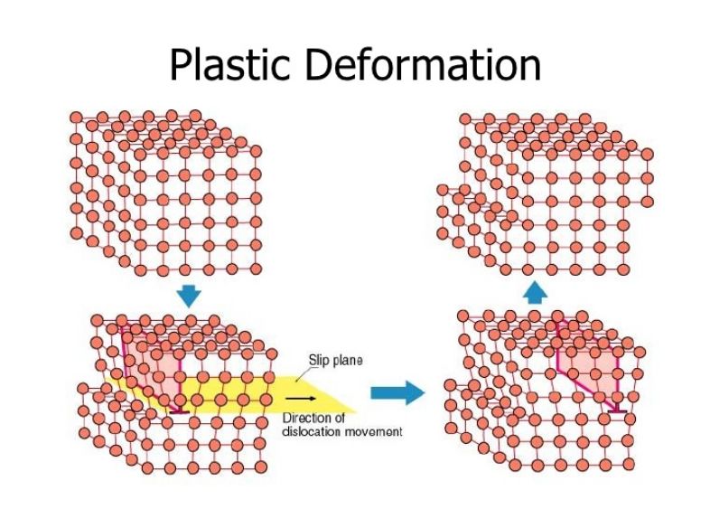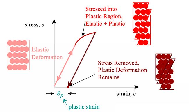 在這一點上,與鄰接的初始原子間的鍵合開始破裂并用一組新的原子進行改造。當這種情況發生時,應力被卸除后材料將不再恢復到原來的狀態,即變形是永久的和不可恢復的。這時材料進入塑性變形區(圖1)。