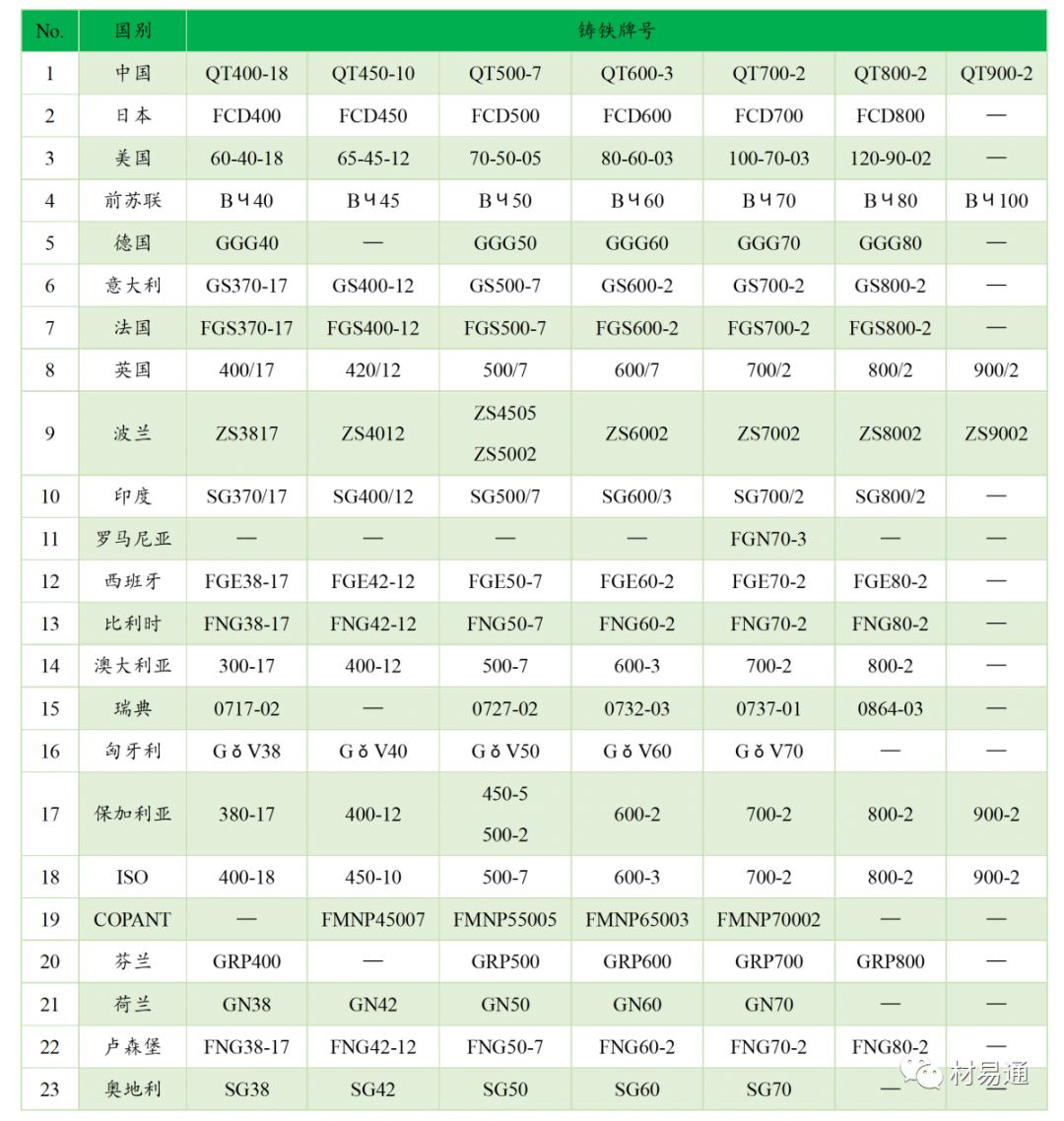 球墨鑄鐵中外牌號對照