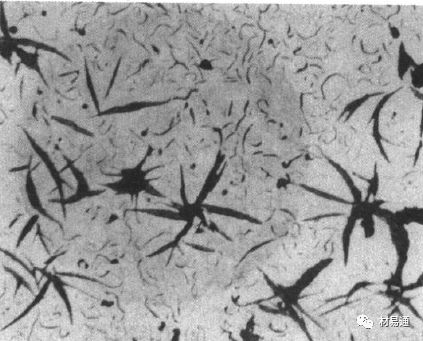 F型(星形)石墨,同C型石墨一樣,F型石墨也是初生石墨,是過共晶成分的鐵液在很大的過冷度下形成的(C型石墨是在小的過冷度下形成的),常出現在高碳薄壁鑄件中。由于是過共晶成分,所以鐵液冷卻時析出初生石墨,又由于冷卻太快,初生相不易長大,而是分叉生長成星狀,然后剩余液相發生共晶轉變,一般生成A型。F型石墨在通常鑄件中很難見到,在活塞環等高碳鑄件上常出現;另外,添加合金硼的鑄件上常會出現F型石墨。