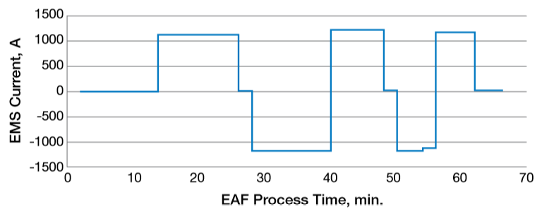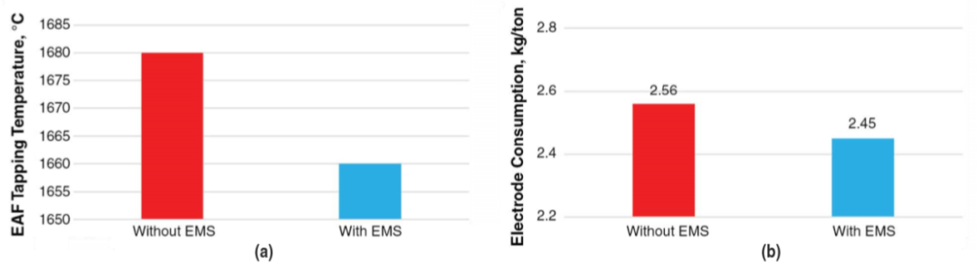 安全性和可靠性一直是電爐運行的重要問題。如前面章節所述,EMS對電弧爐工藝的積極影響對提高工藝可靠性有著重大影響。大塊廢鋼和鉻鐵的快速熔化使熔池的化學成分和溫度快速均勻化,保證了出鋼的目標鋼水重量和溫度。在熔池中攪拌可以減少碳的沸騰。整個熔池內均勻的溫度提供了出鋼的穩定性,減少了出鋼故障造成的推遲。此外,熔池中溫度分層現象的消除明顯降低了出鋼溫度,結果表明,使用EMS可以在不改變LF到達溫度的情況下使出鋼溫度降低15 ~ 20℃。在未攪拌的爐號情況下,一般來說,鋼水在熔池表面附近更熱,所測得的溫度往往不能代表整個熔池的平均溫度。