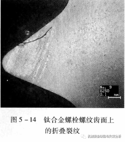 由于工藝參數(shù)選擇不當,或材質(zhì)不良,或潤滑不當,在搓絲與滾絲過程中螺紋表面易產(chǎn)生細小折疊裂紋。因此,在進行螺紋滾壓參數(shù)選擇時,應(yīng)根據(jù)螺紋的絲距、材料、硬度等各種數(shù)據(jù)選定一定的范圍,并通過試驗確定最終的工藝參數(shù)范圍。下圖為某鈦合金螺栓螺紋表面由于工藝不當導(dǎo)致的折疊裂紋。